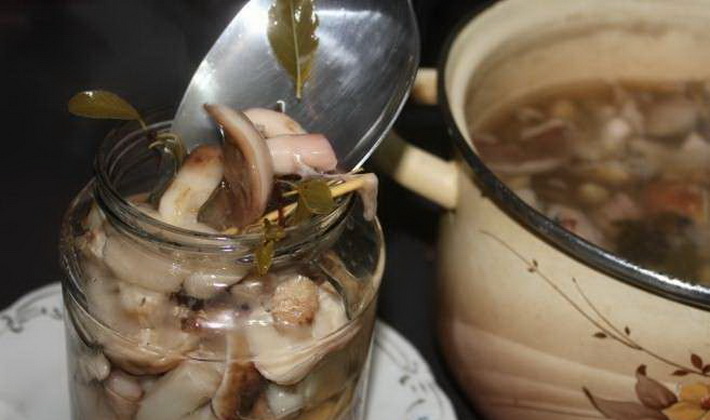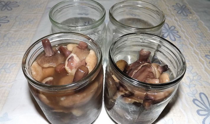 - Nous distribuons les champignons dans des bocaux, nous les remplissons de saumure chaude filtrée, nous couvrons et couvrons et nous laissons refroidir complètement.