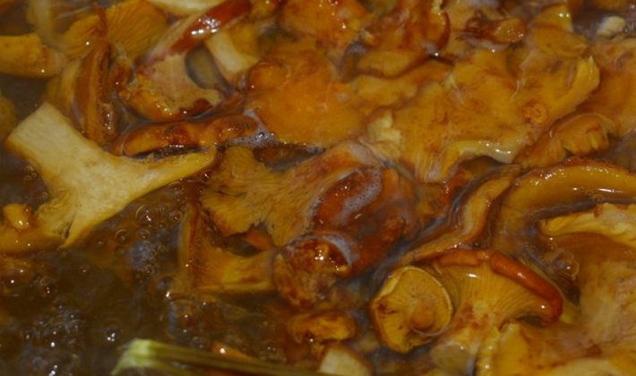 - Un petit lot de girolles est placé dans une passoire et baissé pendant 1-2 minutes. dans de l'eau bouillante salée.