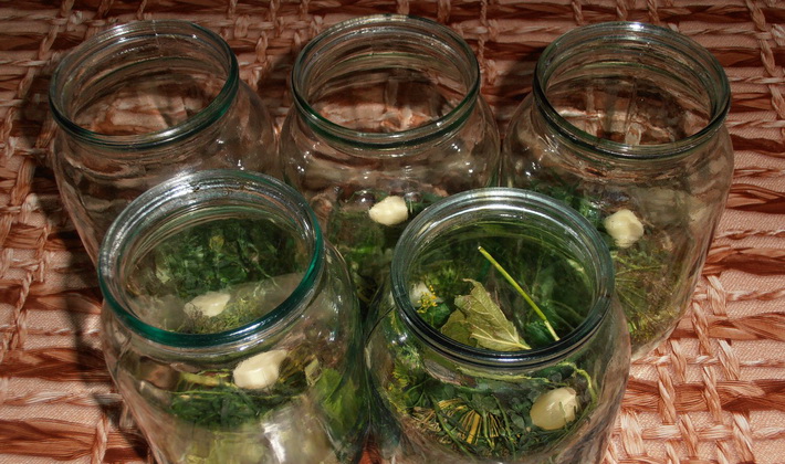 - Dans des pots préparés stérilisés, étalez des feuilles de groseille sèches et propres.
