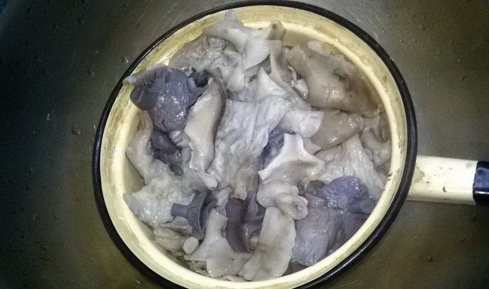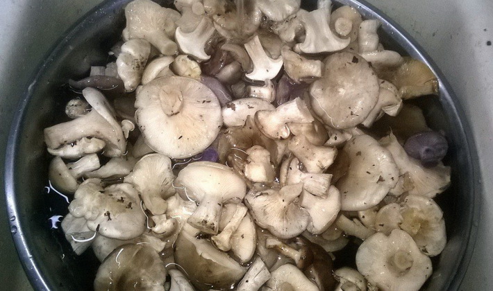 Ensuite, les champignons sont lavés dans une grande quantité d’eau, retirés, laissés à égoutter et introduits dans de l’eau bouillante salée.