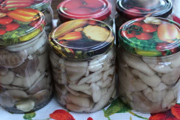 Après la marinade aux champignons, étendre uniformément sur les bocaux et fermer avec un couvercle en métal.