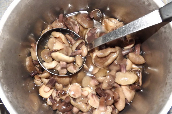 Les champignons pelés doivent être coulés dans de l'eau froide et mis à feu. Comment déterminer combien cuire l'huile pour la conservation? Tout est très simple ici: vous devez les amener à ébullition et cuire pendant 20-25 minutes, en versant 1-2 c. l sel de table et 3-4 c. l vinaigre de table. Retirer les champignons du bol et rincer à l'eau froide. Avant le marinage, il est préférable de couper les gros spécimens en plusieurs parties et de laisser leurs jeunes "frères" intacts.