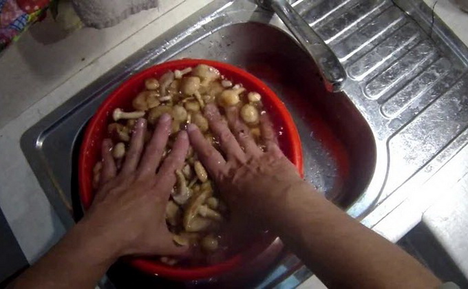 Pour le marinage des champignons, vous devez sélectionner des copies non endommagées, les nettoyer, les couper et les rincer et les rincer dans un seau d'eau pendant 10-15 minutes.