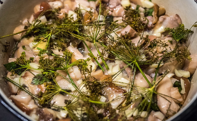 Les champignons marinés, sans couture, sont cuits pendant 15 à 20 jours et conservés pendant environ 3 mois.