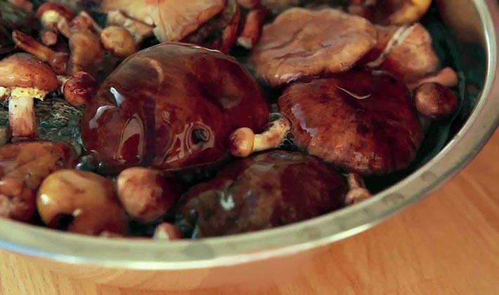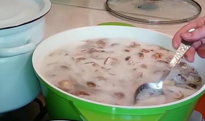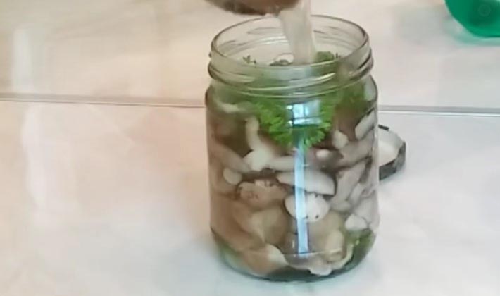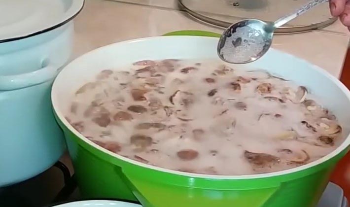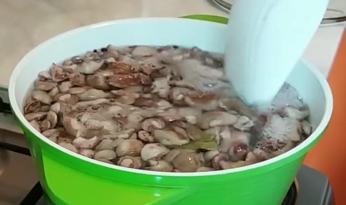 Avant de mariner les champignons de peuplier, ils sont débarrassés des débris forestiers, coupés au bas des cuisses et versez beaucoup d'eau pendant 10 à 12 heures, en même temps, changez l'eau 3-4 fois 3-4 fois pour que les champignons ne deviennent pas aigres.