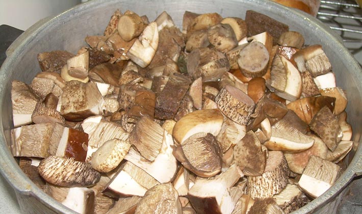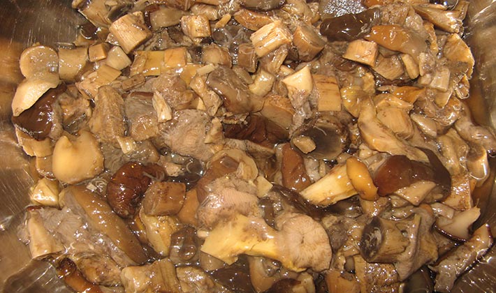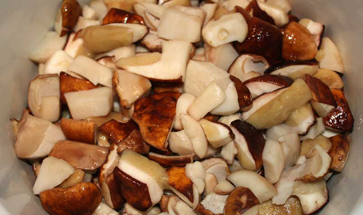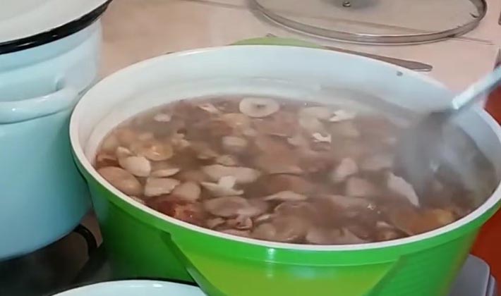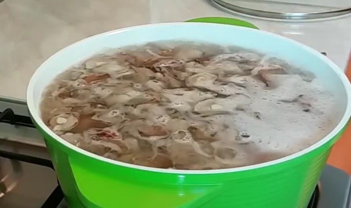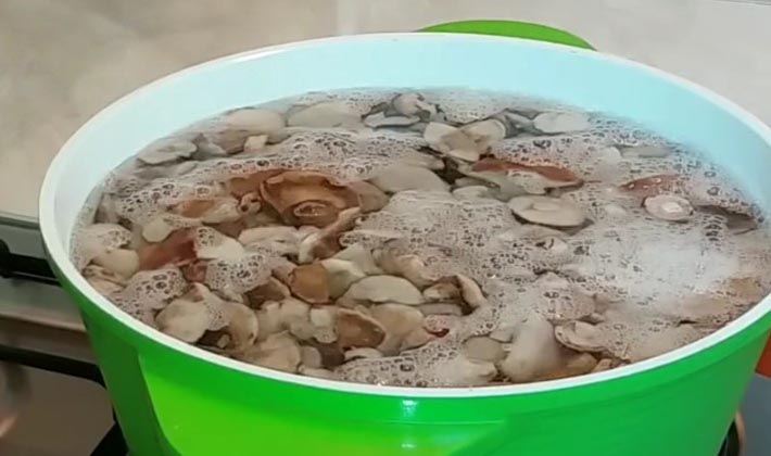 - Les champignons pelés et trempés sont versés dans de l'eau bouillante salée et bouillis pendant 20 minutes.