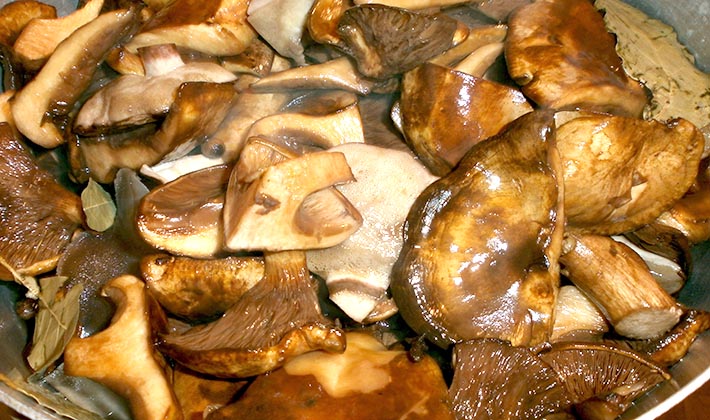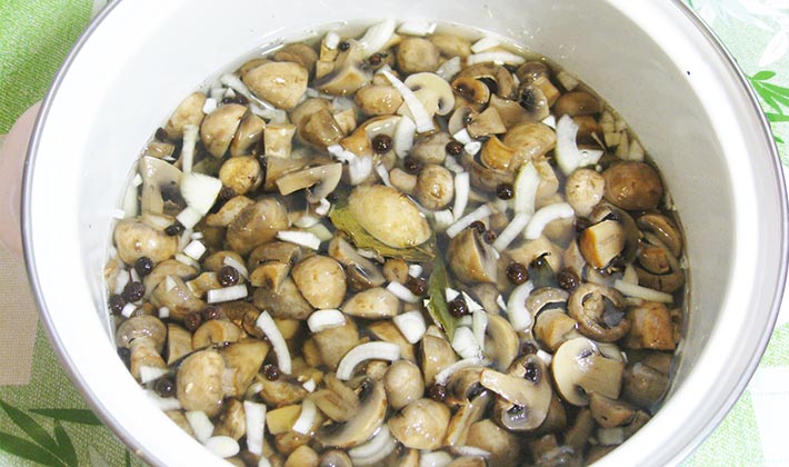 Jeter la feuille de laurier dans la marinade et faire bouillir les champignons pendant 20 minutes.