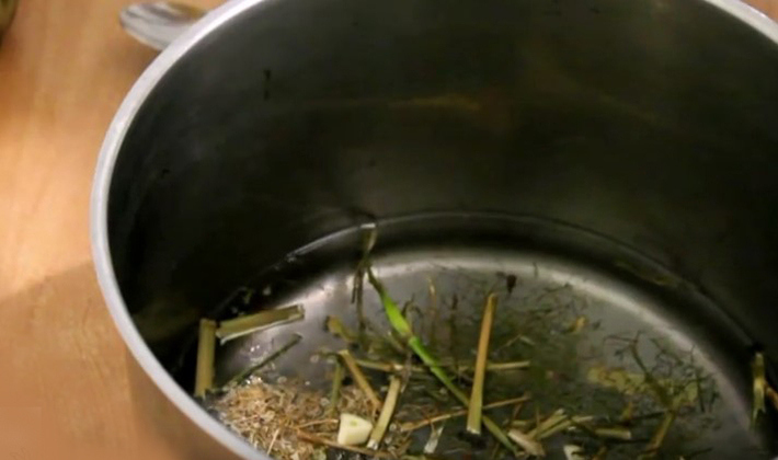 - Laisser bouillir, introduire toutes les épices et les épices (couper l'ail en tranches).