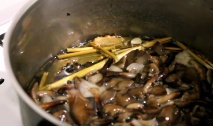 Les champignons bouillis sont introduits, bouillis pendant 15 minutes et laissés à refroidir dans la marinade.