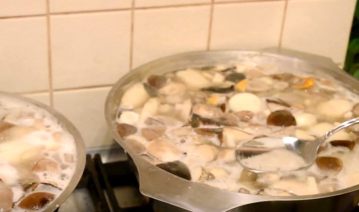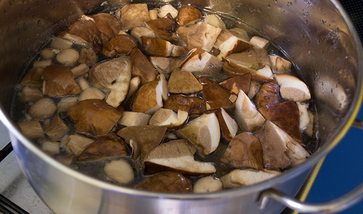 Après le nettoyage, les champignons sont plongés dans de l'eau bouillante.