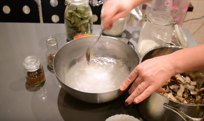 - Pendant que les champignons s'égouttent, une marinade est préparée: le sel et le sucre sont dilués dans de l'eau.