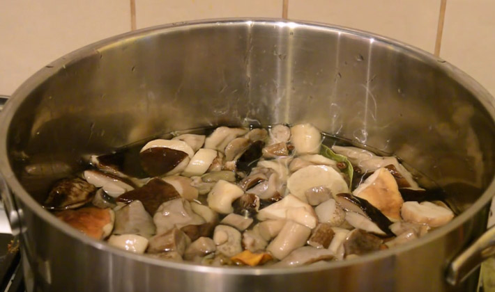 - Mettez les champignons dans de l'eau bouillante salée, ajoutez 2 g d'acide citrique et laissez bouillir pendant 10 minutes.