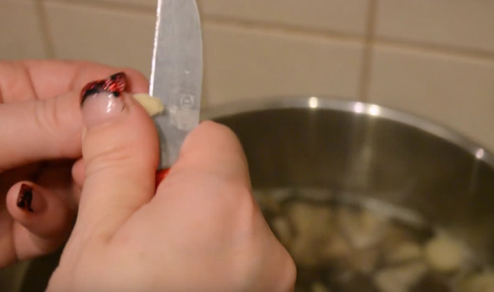 L'ail est coupé en cubes et, avec les épices de la recette, envoyé dans la casserole, à l'exception de l'acide acétique.