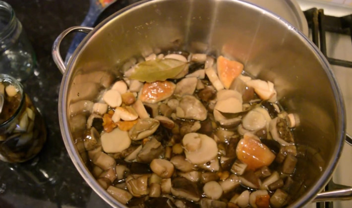 - Sortez la feuille de laurier et jetez-la, mettez les champignons dans des bocaux et versez la marinade.
