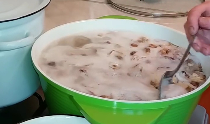 - Après le nettoyage préliminaire et le trempage, les champignons sont versés avec de l'eau et bouillis 2 fois pendant 10 minutes, en changeant chaque fois le liquide.