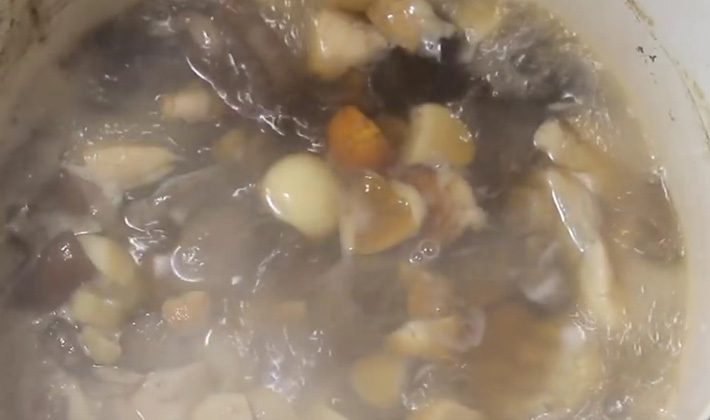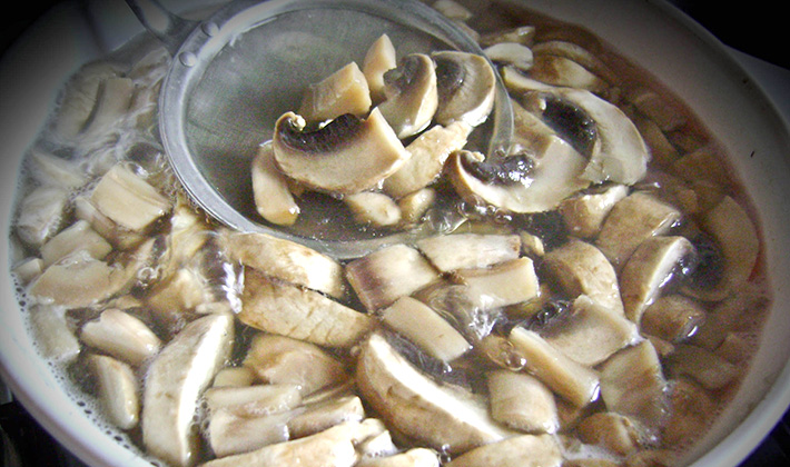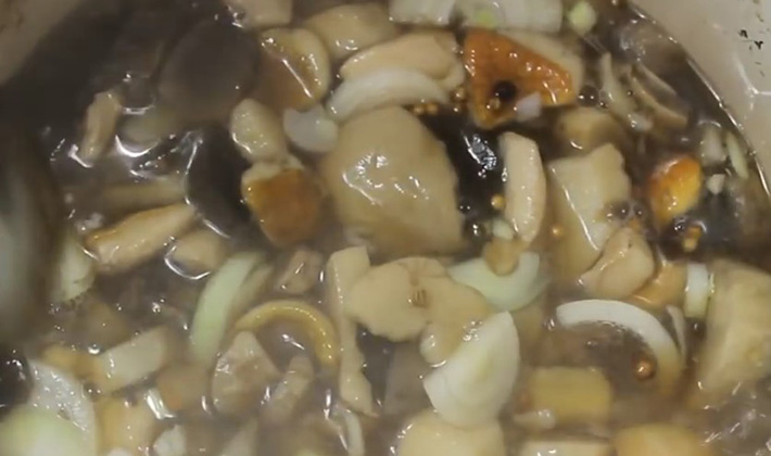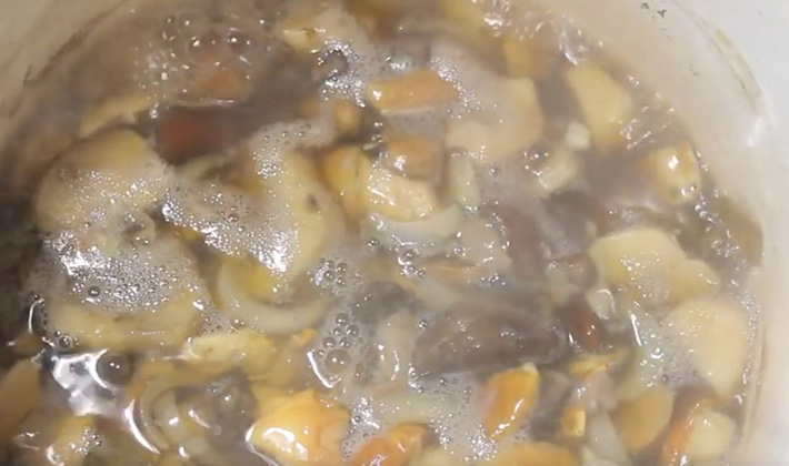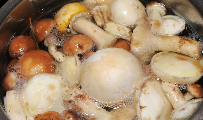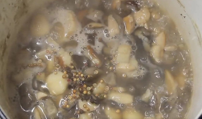 Une autre façon consiste à faire bouillir les champignons et à les plonger dans la marinade de porcini bouillante déjà préparée. Avec cette méthode, la marinade s’avère plus légère, plus pure et plus transparente, mais inférieure au produit préparé de la première manière en termes de force de l’odeur et du goût de champignon. Le sel est agité jusqu'à dissolution complète, la solution est portée à ébullition et les champignons préparés sont chargés dans la chaudière. Les champignons sont bouillis avec une légère ébullition et en remuant avec une rame en bois, tout en éliminant la mousse résultante.