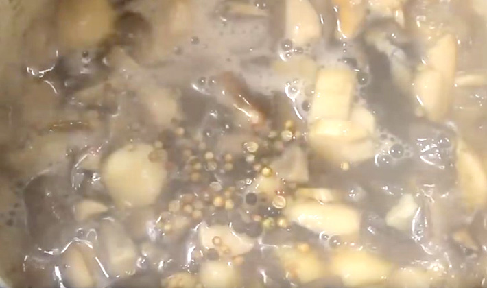 Cuire les chapeaux de champignons dans une marinade bouillante pendant environ 25-30 minutes et les cuisses de champignons - 15-20 minutes.