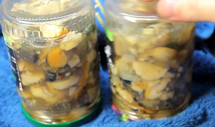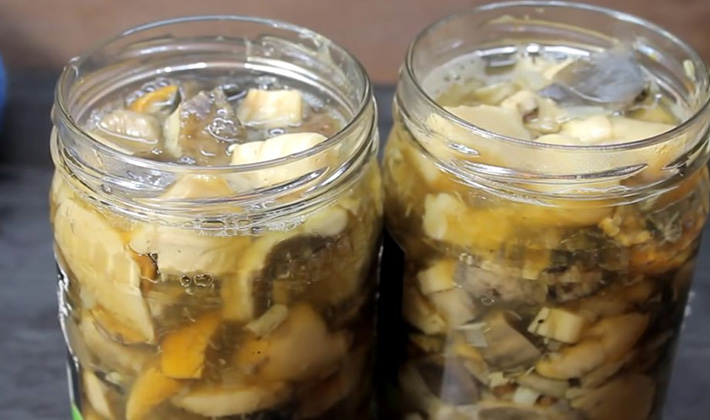 Refroidissez les champignons rapidement, mettez-les dans des bocaux, versez la marinade fraîche et fermez-les avec des couvercles en plastique.