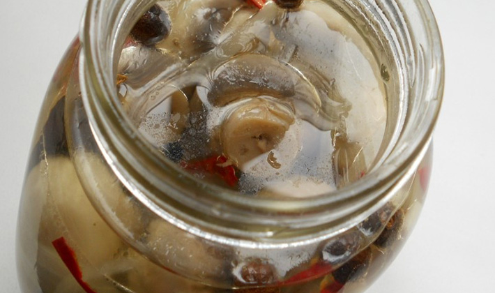 Pour le marinage, sélectionnez des petits champignons ou coupez-les en gros morceaux. Épluchez les champignons frais, rincez-les à l'eau froide et, après les avoir jeté sur une passoire, laissez l'eau s'écouler. Ensuite, faites bouillir les champignons dans une petite quantité d’eau ou sans ajouter d’eau pendant 5 à 10 minutes. Préparation de la marinade: versez de l'eau dans les plats et faites-la bouillir pendant plusieurs minutes avec du piment, des oignons émincés et des carottes, ajoutez de l'acide acétique en fin de cuisson. Tremper les champignons légèrement séchés dans la marinade et cuire pendant 4-5 minutes, puis assaisonner. Transférer les champignons dans des pots ou des bouteilles, verser la marinade de manière à en recouvrir les champignons. Fermez immédiatement les plats, laissez-les refroidir et placez-les dans la réserve. Pour clarifier la marinade, retirer les champignons du bouillon, les verser avec du vinaigre, diluer avec de l'eau et assaisonner de sucre. Les champignons sont à nouveau bouillis dans cette marinade et transférés dans un bocal.