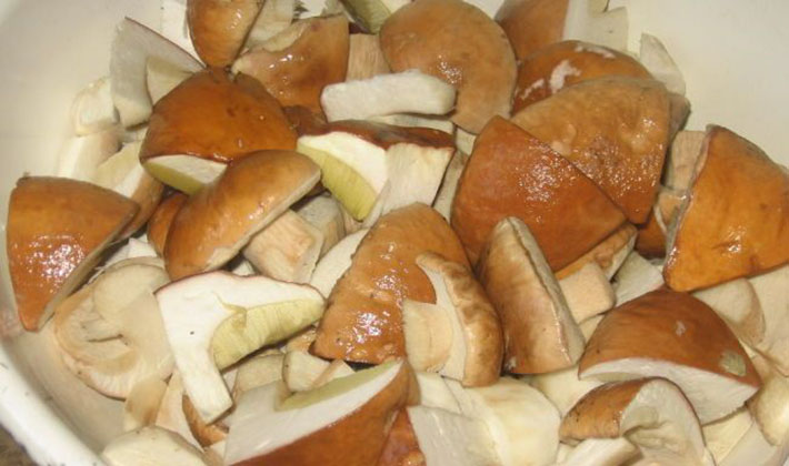 Il s’agit d’une recette simple pour cuire les cèpes en l’hiver: ils sont nettoyés, rapidement lavés à l’eau froide et jetés dans un tamis. Les petits champignons sont laissés entiers, gros coupés en morceaux. Les champignons sont placés dans une casserole à fond humide, saupoudrée de sel et chauffée. Dans le jus attribué, les champignons sont bouillis pendant 5 à 10 minutes. Ensuite, ajoutez le piment de la Jamaïque et l'oignon et laissez cuire encore quelques minutes. Pour la marinade, vous pouvez utiliser du jus de champignon en y ajoutant de l'acide acétique (marinade sombre). Si vous préférez une marinade légère, les champignons sont retirés du jus. Et de l'eau, du sucre et de l'acide acétique, on fait bouillir la marinade. Ensuite, les champignons y sont incorporés avec les assaisonnements, cuits à ébullition pendant plusieurs minutes, placés dans des pots et immédiatement fermés.