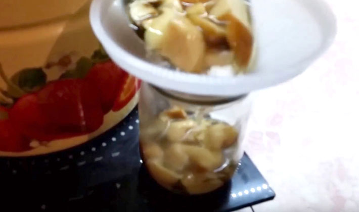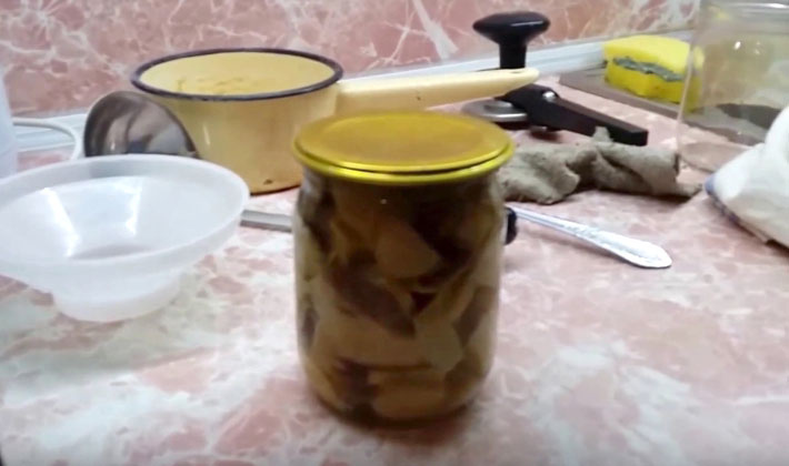 Lorsque la mousse cesse de se former dans la marinade bouillante, ajoutez des épices dans la casserole. En fin de cuisson, les champignons doivent être retirés du feu et refroidir rapidement avec la marinade, en recouvrant la poêle de gaze ou d'un chiffon propre. Ensuite, transférez les champignons dans des bocaux en verre et versez la marinade dans laquelle ils ont été cuits. Les banques doivent être fermées avec des bouchons en plastique ou une glassine et stockées dans un endroit froid.