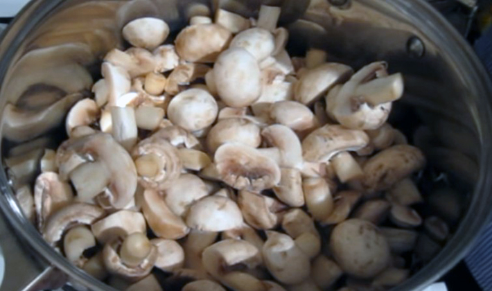 Les champignons doivent être nettoyés, coupés au bout des cuisses, rincés et coupés en 4 parties.