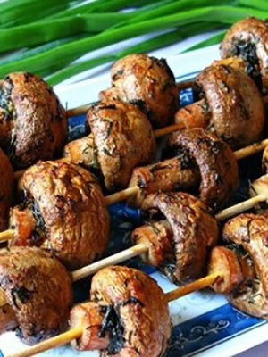 - Humectez les brochettes et ficelez soigneusement les champignons, placez-les sur la braise et faites-les frire au maximum 20 minutes. Pour rendre les champignons plus attrayants et juteux, enfilez des tranches de tomate entre eux.