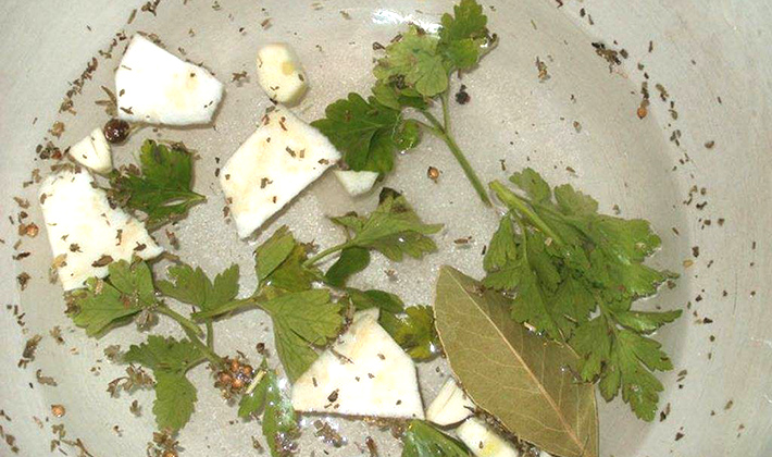 - Ajoutez l'ail, l'aneth, le poivre et le laurier finement hachés ou broyés.
