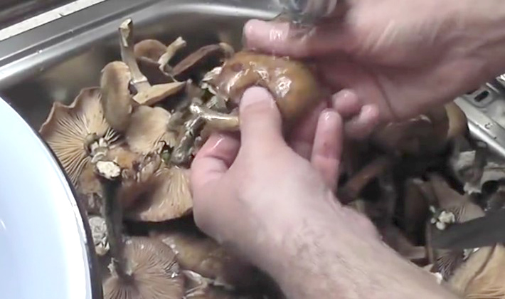 Les champignons au miel sont triés des fruits gâtés, des restes d’herbe et de feuilles, soigneusement lavés dans une grande quantité d’eau.