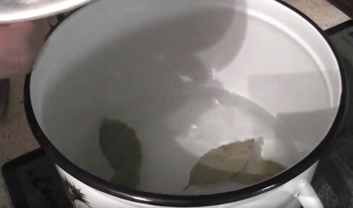La marinade est préparée dans un bol émaillé séparé: le sel, le sucre et les épices sont combinés dans de l'eau, à l'exception du vinaigre et de l'ail.