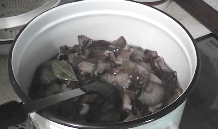 - Les champignons de miel sont débarrassés de l'herbe et des feuilles adhérentes, coupent la partie inférieure des cuisses et cuisent à l'eau pendant 25-30 minutes.