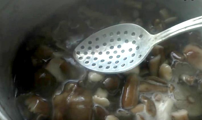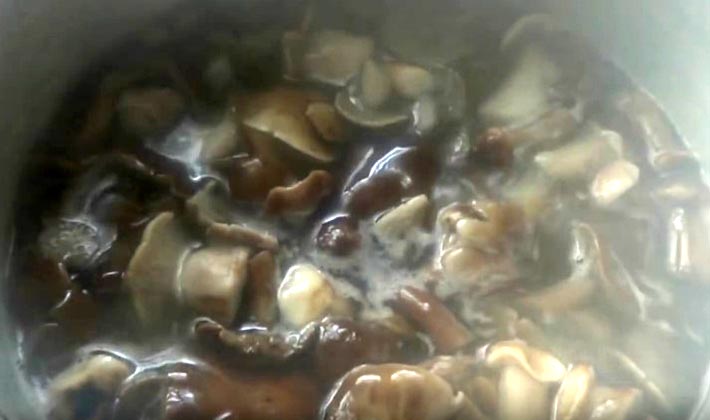 - Faites bouillir de l'eau et déposez les champignons, faites bouillir pendant 25-30 minutes, inclinez-vous dans une passoire pour mettre tout le liquide en verre.
