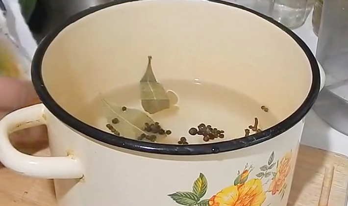 Changer l'eau dans la casserole sans laver le contenu, ajouter 25 g de sel, 10 pois de poivre, 5 girofles, 2 feuilles de laurier et de l'aneth séché avec des graines pour 2 l.