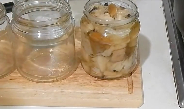 Pour le stockage de l’hiver, les porcs recevant les champignons marinés doivent être pliés en pots, parsemés de couches d’épices broyées.