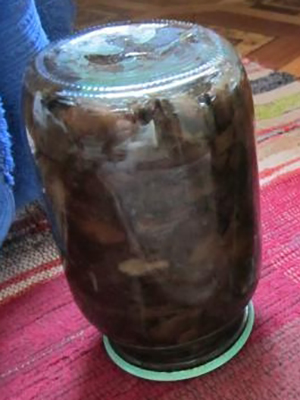 Ensuite, tout est mis dans des pots propres, remplis de marinade et d’huile végétale, mais vous ne pouvez pas les rouler, mais les cacher simplement dans la cave.