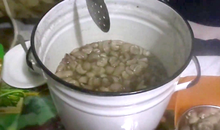 - Faire bouillir à feu moyen pendant 15 minutes, mettre les champignons dans des pots stérilisés et les écraser à la cuillère.