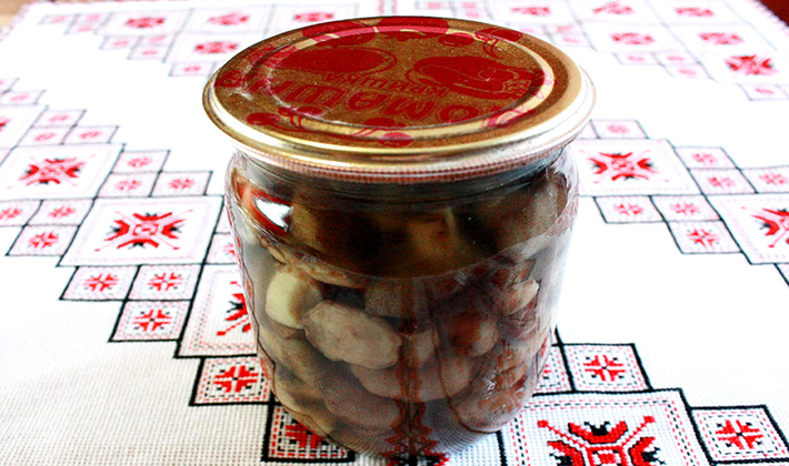 Ajouter les oignons et cuire ensemble pendant 5-7 minutes. Introduisez ensuite le vinaigre de table, le sucre au goût et laissez mijoter 5 à 10 minutes supplémentaires en ajoutant l’ail et l’aneth. Essayer le sel sera mieux si la marinade est légèrement salée. Ajouter l'huile végétale, mélanger et laisser refroidir. Étendez-vous sur les berges et roulez. En outre, ces champignons peuvent être consommés après 7 heures.