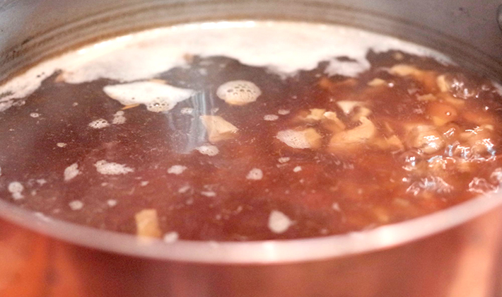 Porter à ébullition, puis cuire à feu doux, en éliminant constamment la mousse. Lorsque l'eau devient claire, ajoutez du sucre, diverses épices et de l'acide citrique.