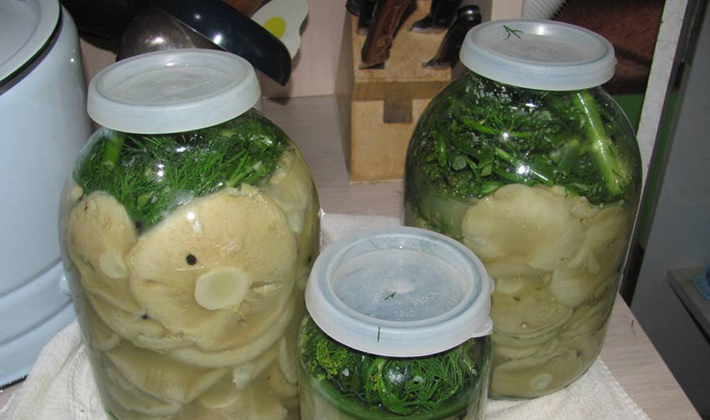 Pour prolonger la durée de conservation, ils doivent être stérilisés. Préparez une garniture pour cornichons chauds: versez de l'eau dans l'ustensile, ajoutez des épices et de l'acide citrique, faites bouillir pendant 20-30 minutes, ajoutez 9% de vinaigre. Remplissage de la marinade chaude (90–95 ° C) pour verser les champignons. Stériliser à 100 ° C: pots d'une capacité de 0,5 à 25 minutes, de 1 à 35 minutes.