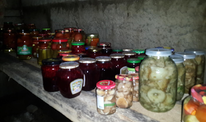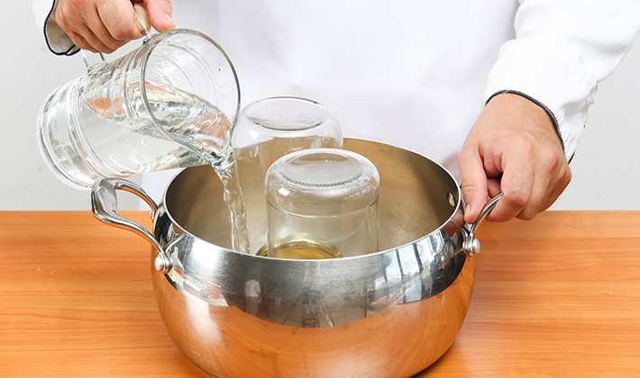 Les bidons se remplissent juste sous le haut du cou et se couvrent des couvercles. Ensuite, ils sont placés dans une casserole avec de l'eau chauffée à 70 ° C pour la stérilisation, qui est effectuée à ébullition pendant une demi-heure.