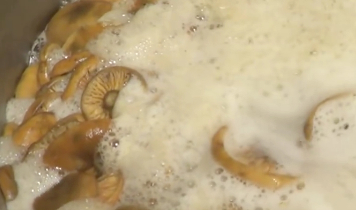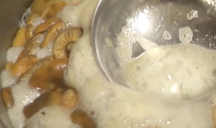Les champignons pré-safran purifiés et lavés sont versés à l'eau froide et cuits à ébullition pendant 20 minutes à feu moyen, en éliminant constamment la mousse de la surface.