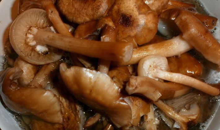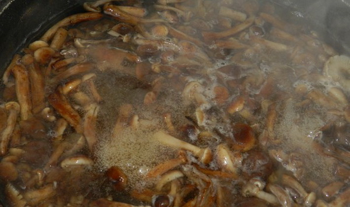 - Les champignons de miel purifiés sont introduits dans de l'eau bouillante et bouillis pendant 25 minutes.