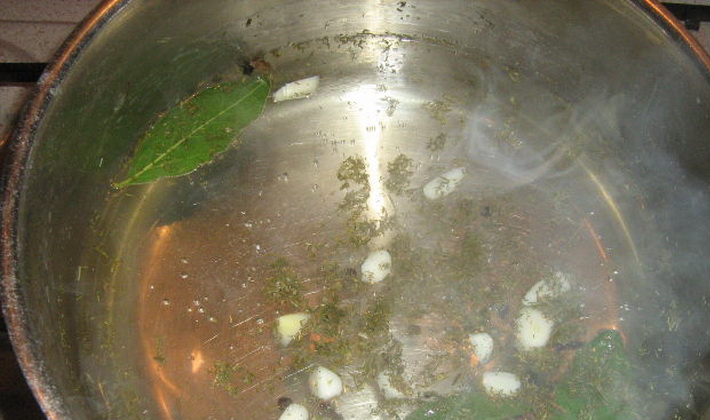 - Nous faisons d’abord une marinade: dans l’eau, combinez le sel, le sucre, le vinaigre, la cardamome et le laurier.