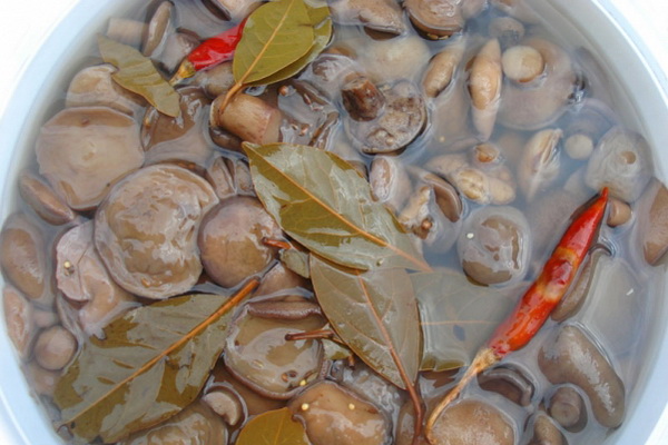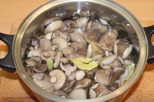 Mettez les champignons dans l'eau bouillante, ajoutez les graines de moutarde, le laurierka, le poivre noir, l'ail émincé et laissez bouillir pendant 15 minutes.