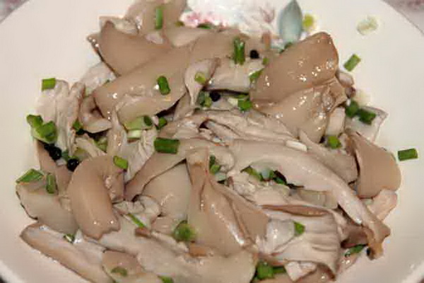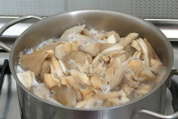 Les champignons à huîtres doivent d'abord être bouillis dans de l'eau salée pendant environ 10 minutes, puis transférés dans une passoire pour retirer le liquide et laisser refroidir. Les petits chapeaux peuvent rester intacts et les plus grands peuvent être coupés en morceaux.