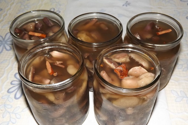 Mettez les champignons dans des pots propres, ajoutez toutes les épices décrites dans la recette et versez la marinade chaude.