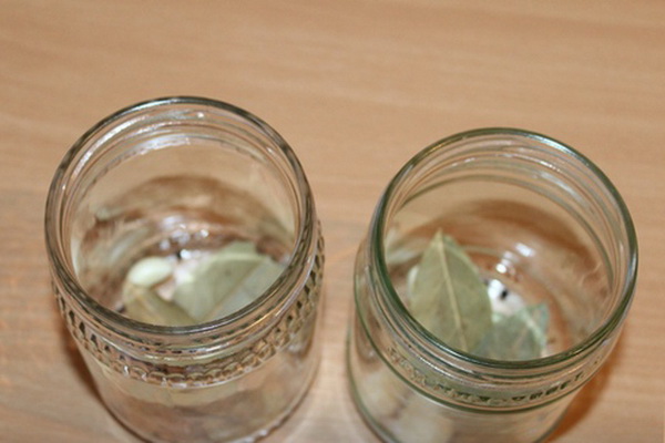Dans un bocal en verre stérilisé au fond, mettre des pois de piment de la Jamaïque et du poivre noir, ainsi qu'un lavrushka.