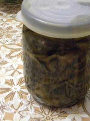 Le récipient est retiré du réchaud et laissé refroidir. Ensuite, l'huile est placée dans des pots stérilisés, versée avec une saumure refroidie et roulée.