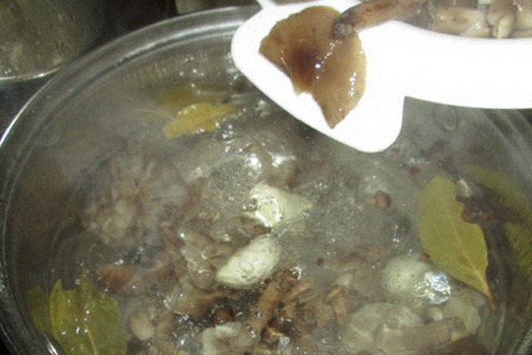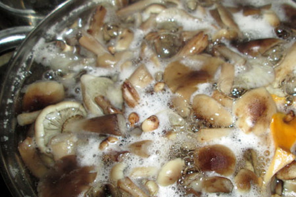 Énumérer les champignons envahis par la végétation, les débarrasser de toute contamination et les mettre dans de l'eau bouillante. Faites bouillir pendant 20 minutes en retirant de temps en temps la mousse des champignons.