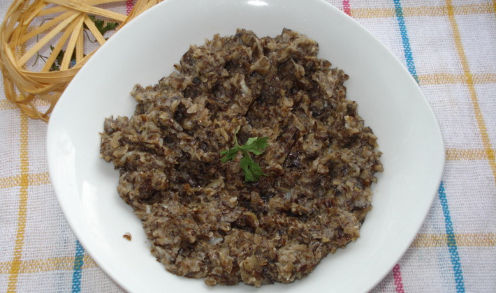 - Les champignons sont frits jusqu'à ce qu'ils soient dorés, hachés avec un hachoir à viande et combinés avec des légumes.